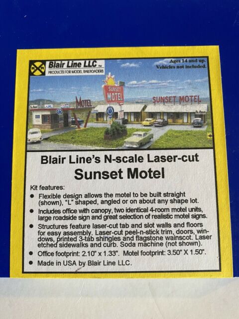 The main office is done up in a streamline moderne style and comes with canopy and rooftop Motel sign, laser-etched sidewalks and curb, plus optional flagstone wainscot. Two four-unit motel units are provided, which feature tab and slot scribed walls, roof and floor. Peel-n-stick doors, windows, gable vents, trim and laser-cut printed 3-tab roofing are all included. Decorative porch posts and laser etched sidewalks, plus a rooftop "Sunset Motel" sign provide the finishing touches. Parts are included to build a spectacular laser-cut sign for the front, a soda machine, and additional full-color signs (taken from photos of actual hotels) are included to customize your structure.