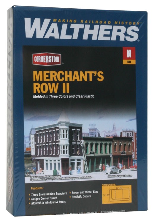 TThe Walthers Cornerstone N Scale Merchant's Row II kit brings together three different stores in one structure. Often just a few blocks away from the railroad tracks, the business district is one of the most important parts of any small town or big city. This unique kit combines three storefronts into one space-saving structure that fits on almost any N Scale layout. Add your personal touch to Merchant's Row II with paint and the supplied full-color decals to create a one-of-a-kind model for your steam or diesel-era scene. Merchant's Row II is one of many Cornerstone N Scale businesses.