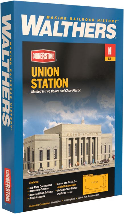 For generations of travelers, Union Station was the magical gateway to and from the world. The Walthers Cornerstone Union Station will be the gateway to your layout! Here is where the journeys of the finest trains on the line started and ended. Where travelers rushed to make their connections. And thousands of commuters began and ended their workday. Where space was limited in larger towns and cities, two or more railroads would often combine their resources to build and operate major terminal stations. Monuments to the power and success of railroading, they also projected the spirit of the community they served and the promise of excellent service for anyone who traveled by train. Union Station is a fitting tribute to the grand terminals that served railroading for over 100 years.