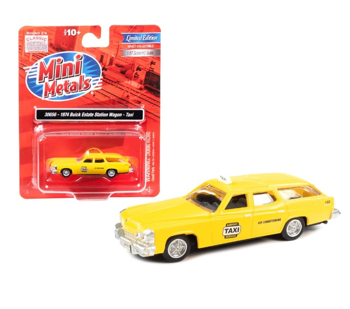 This Classic Metal Works Mini Metals HO Scale 1974 Buick Estate Wagon is perfect for North American street and highway scenes. This detailed pickup model features a die cast metal body, interior seats, window glazing and authentic decoration. Perfect for a family vacation or carting groceries around town, this station wagon sis a great addition to any 1970s and later layout scene.