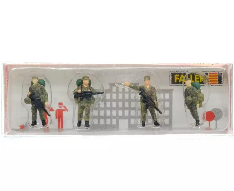 Enhance your HO scale model railroad or diorama with the Faller 1/87 HO Scale 4 Soldiers with Baggage Miniature Handpainted Figures Set. This meticulously crafted set features four intricately detailed soldiers, each posed carrying various pieces of military baggage. Expertly handpainted to bring out lifelike details, these figures add a touch of authenticity and dynamic storytelling to your scenes. Perfect for hobbyists and collectors, this set captures the essence of military realism in miniature form. Add these finely crafted figures to your collection and bring your miniature world to life with Faller's unparalleled quality and attention to detail.