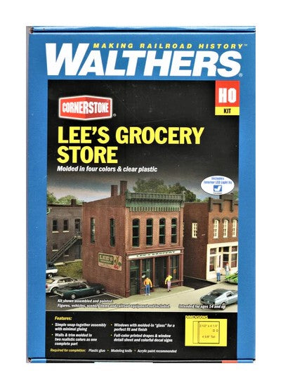 Attention HO shoppers, check out the great features of the Lee's Grocery Kit from Cornerstone! Designed for simple snap-together construction with little or no gluing needed, window mullions are molded into glass for true to scale appearance. Parts are also molded in realistic colors so no painting is needed. Other features include: