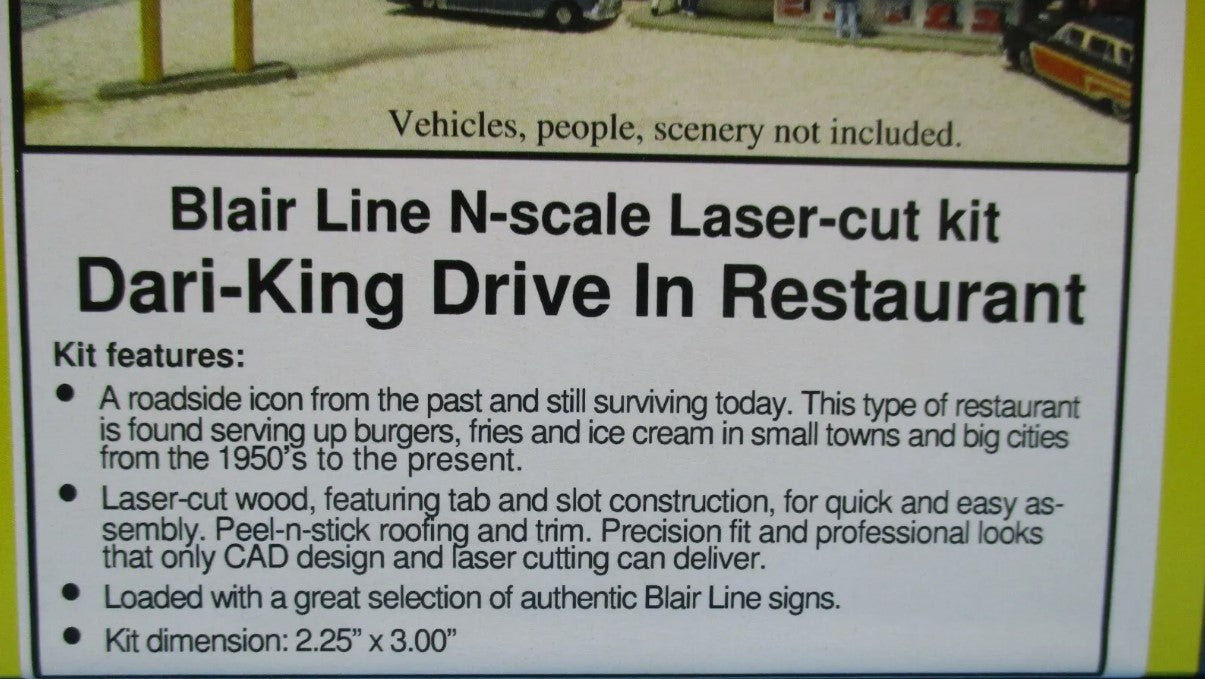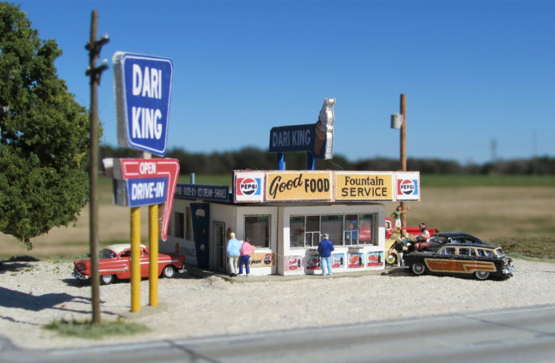 This type of eating place has been a roadside icon since the 1940's and still survives today, serving hamburgers and ice cream in places where the fast food franchises have not yet taken over. Kit depicts a typical drive in that began as small walk-up ice cream stand, had a dining area built on and evolved into a full menu fast food walk-up and dine-in restaurant typical of many that operated all over the U.S.A.