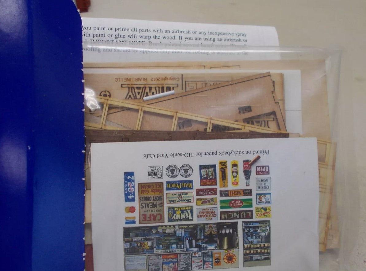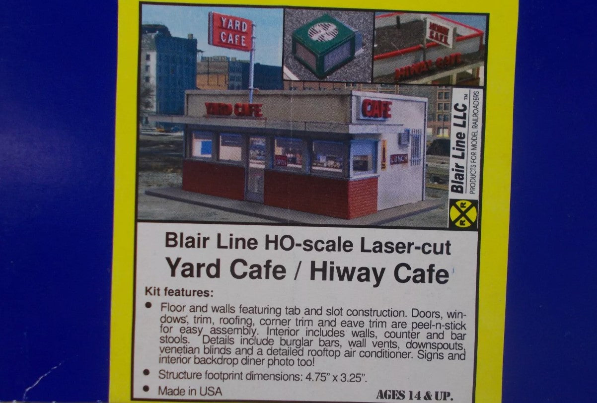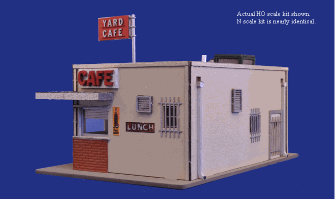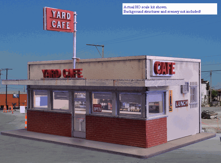 Open 24 hours a day, this small eatery is the perfect place for your train crews to go for beans. This blue collar style cafe will be right at home near a rail yard, trackside in an industrial area or alongside a busy city street or state highway. Signs for both the Yard Cafe and Hiway Cafe are provided, and a lot of detail is packed into the small footprint, which was adapted from a scratchbuilt S scale model by Philippe Coquet. Kit includes interior walls, counters, barstools and a detailed photo of a typical diner cooking area for the interior back wall, Cafe signs for each side of the building, laser cut Yard Cafe and Hiway Cafe signs for the front of the awning and rooftop sign, a detailed laser cut rooftop air conditioning unit. plus burglar bars, wall vents, downspouts, and a selection of restaurant and cafe signs based on period photos.