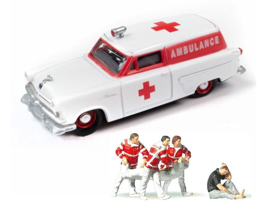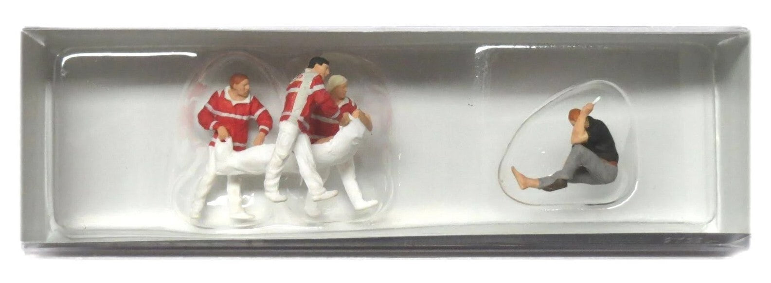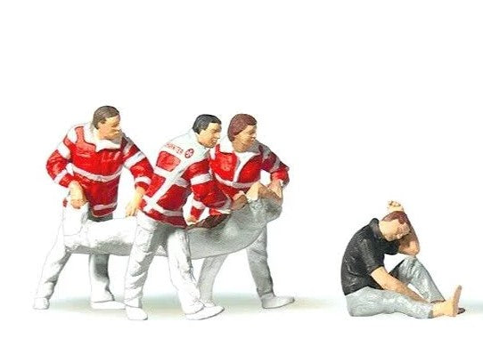 Now its easy to add Emergency Scenes to your HO layout with this exciting series of officially licensed replicas from Preiser figures! Prefect for modern layout scenes, this set delivers 4 figures, handpainted in correct red-white paramedics uniforms and molded in realistic action poses.