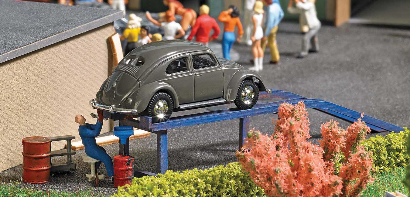 Busch 1/87 HO Scale VW Old Beetle+Mechanic+Oil Change Ramp+Barrels (Action Set)