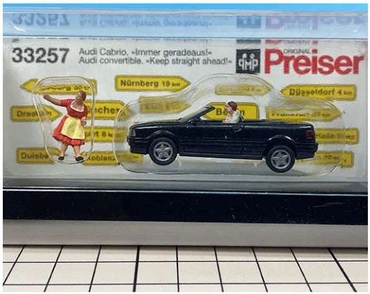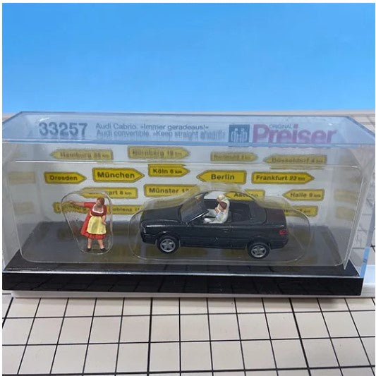 Navigate your model town with ease with Preiser's HO Scale Audi Convertible Set. This finely detailed set includes a sleek Audi convertible with two occupants, along with a helpful woman giving directions. Add a touch of realism to your model railroad or diorama with this meticulously crafted set, perfect for adding life and character to any urban or suburban scene. Whether cruising down main street or exploring the countryside, this set is sure to enhance the charm of your HO scale layout.