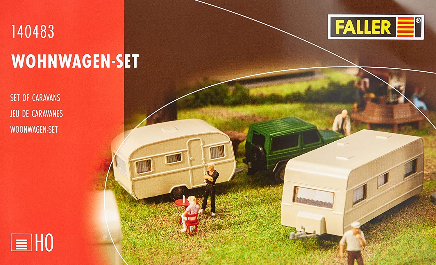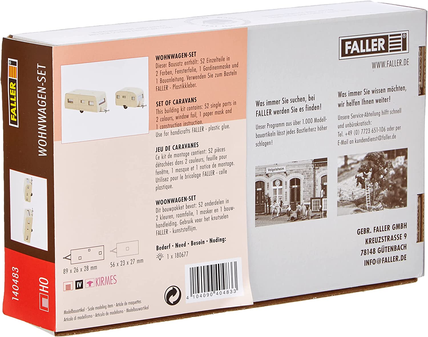 The Faller HO Scale 1970s Camper Trailers Wohnwagen-Set contains: 52 single parts in 2 colors, window foil, 1 paper mask and 1 constuction instruction.