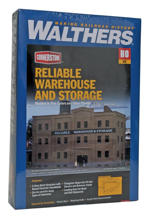 Walthers Cornerstone HO Scale Reliable Warehouse and Storage is a great factory or warehouse that's easily placed on any layout. The growth of railroads in the late 19th century attracted new industries to the right-of-way. Businesses located close to the tracks, often on odd-shaped lots. These structures are still common. The triangular shape is ideal for corners or between a mainline and spur. A roof-top water tower, stairway, chimney and loading dock are all included. Great for steam-era and transition-era scenes, many structures like Reliable Warehouse and Storage still stand today. Reliable Warehouse and Storage a wonderful addition layotu scenes amont other Cornerstone HO Scale industry kits.