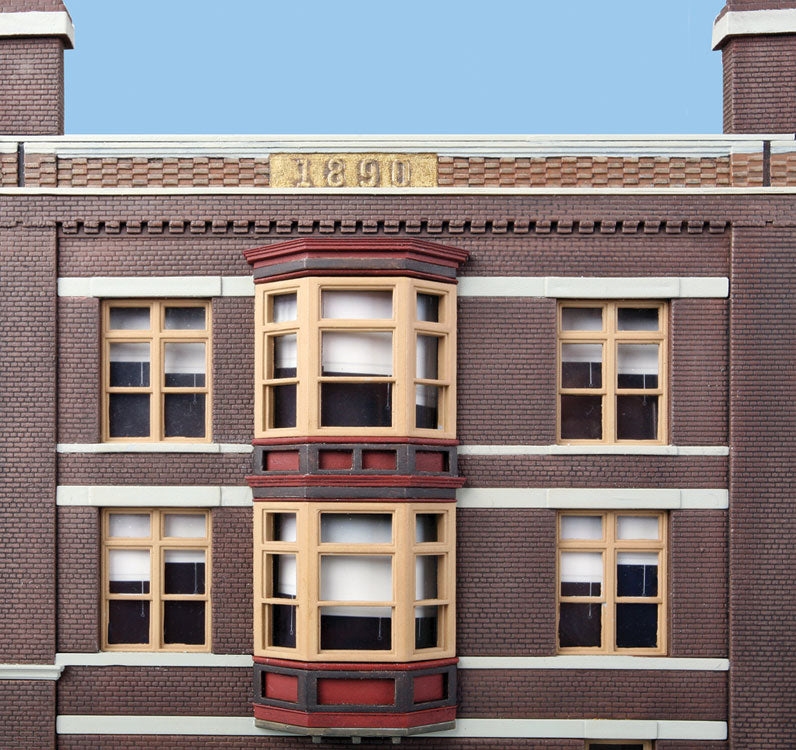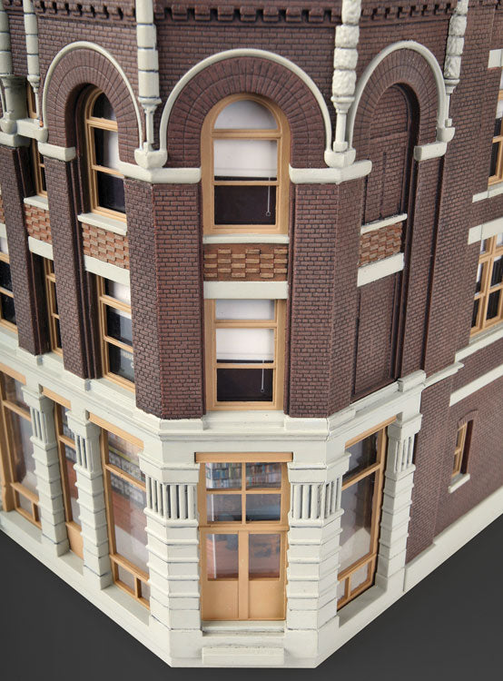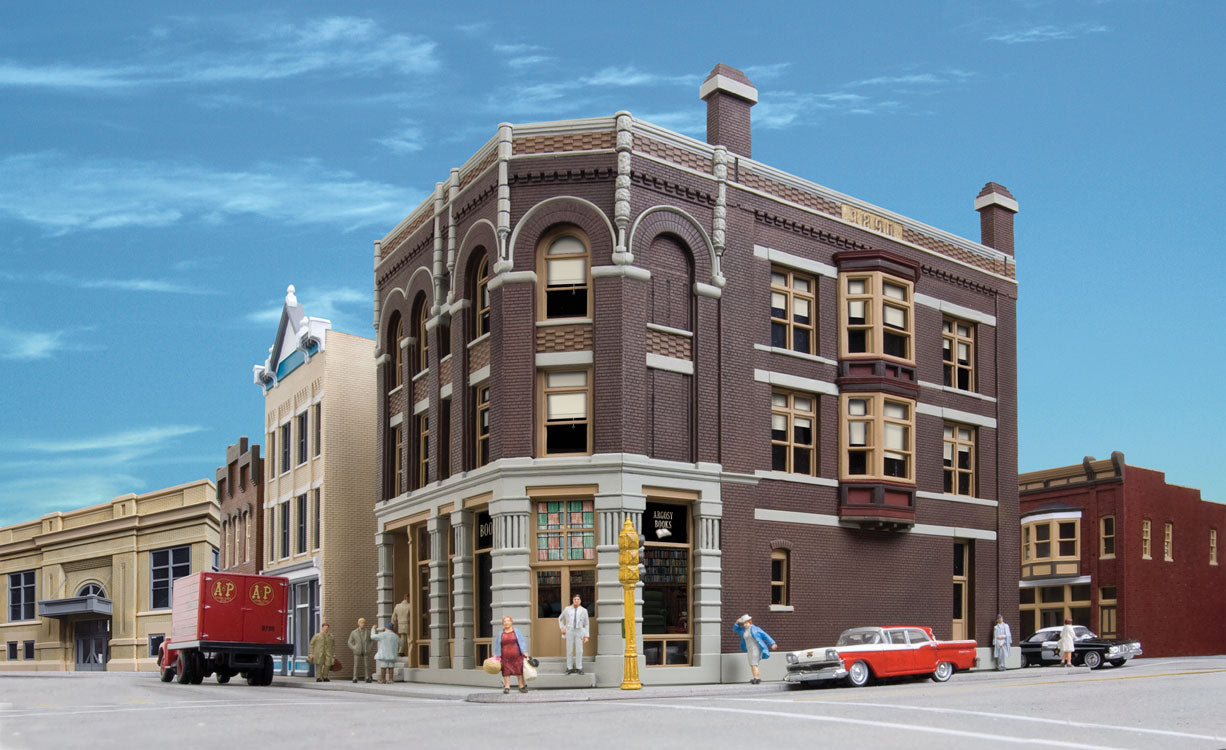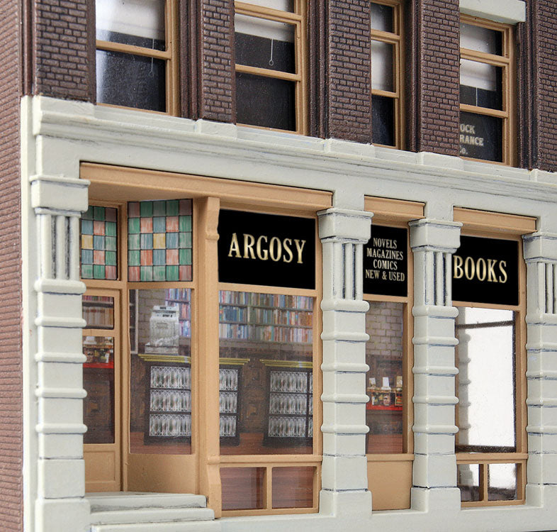 Argosy Booksellers is part of the selection of Walthers Cornerstone brick storefront building kits patterned after those you'll find in towns across the continent. Back in the day the family would all pile into the back of Dad's old pick-up and rattle into town. There was something special about those old buildings. All of those fancy details and trim left an impression, even on the kids. There was always a stop at the hardware store. Mom could spend all day at Smith's, where they had nice clothes. Kids would dream about the toys at the dime store. And the folks never could say no when they begged for ice cream! Main Street hasn't changed much over the years and stores like Argosy Booksellers are built to last. Buildings tell a lot about your layout, especially in a business district with colorful signs that set the time and place. Modeling this important feature is easy with Argosy Booksellers because it combines a business on the first floor and apartments of offices on the second and third floors - typical of buildings constructed in the late 1800s through the 1930s and still in use today. Personalize your model with paint from your dealer, and add the finishing touch with the colorful signs in the kit.