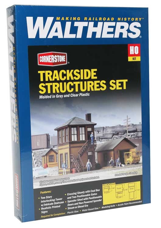 The Walthers Cornerstone HO Scale Trackside Structures Set includes easy-to-build kits for a wooden interlocking tower, crossing shanty and speeder shed. The structures match those offered in the Walthers Built-ups Trackside Structures Set but are unassembled and undecorated for easy customization and kitbashing. All parts in this version are molded in gray for ease of painting, and complete instructions for all three buildings are included. Used as a group or by themselves, these buildings say "railroad" on any layout, module or diorama scene. They're typical of the designs used by North American railroads large and small from the 1880s to the 1970s so they fit any location and era. Perfect for main, branch, shortline or industrial roads, you can use several sets to make your entire line more realistic. Use the Trackside Structures Set with a wide variety of Cornerstone HO Scale railroad buildings.