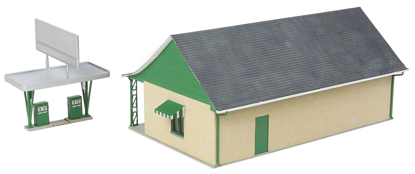 Need gas, beef jerky and a bag of chips? The Walthers Cornerstone Country Store is just the place! Based on gas station convenience stores that sell all kinds of products, it's perfect for roadside scenes on your layout. The kit features a main building with a curved pitched roof, gas pump island with a canopy and two pumps. Parts are molded in appropriate colors and full-color printed signs are included. The Country Store measures: Main Building: 6 x 3-5/8 x 2-3/4" 15.2 x 9.2 x 6.9cm; Gas Pump Island: 2-1/2 x 2-1/2 x 2-3/8" 6.3 x 6.3 x 6cm. the Country Store is just one of many Walthers Cornerstone HO businesses.