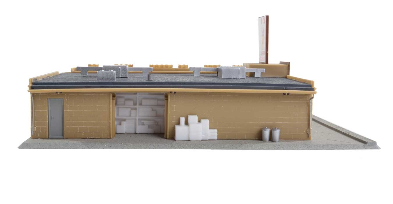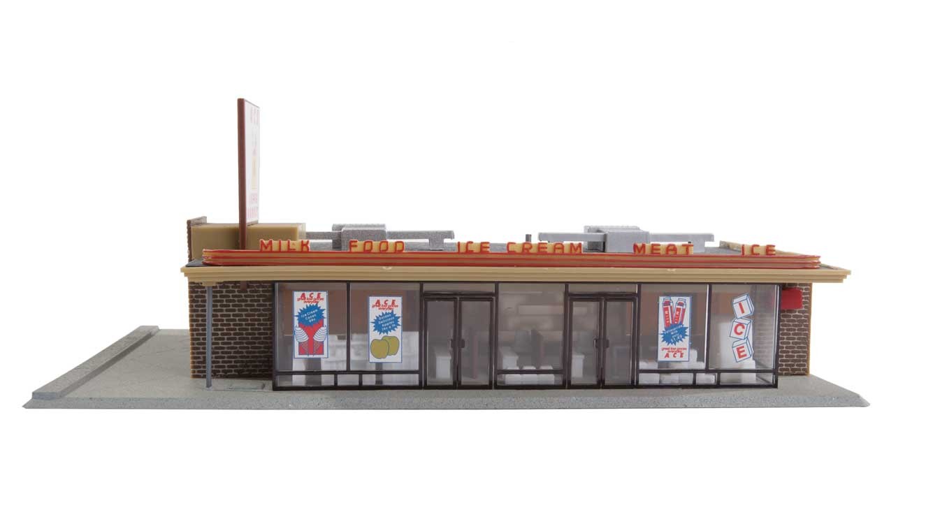 Remember to buy bread and milk on the way home! A quick stop is easy when this neat supermarket is part of your city scene. It includes a full interior with cash registers, shelves and an ice machine, while there's a loading door for the exterior.