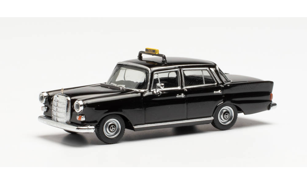 Anyone who took a taxi in the 1960s drove a Mercedes-Benz. Taxis in Germany were still black in color until 1971, only then was the legal color specification changed to light ivory. Herpa is initially realizing this new car model in black with a corresponding taxi sign.