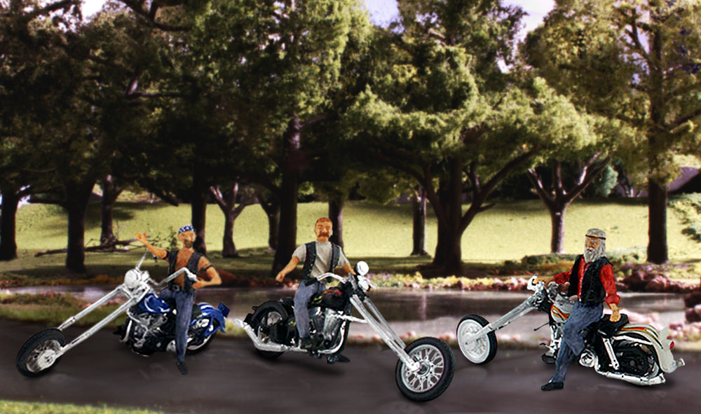 Three bad boys, complete with tattoos and pony-tails, set ready-to-ride on their custom choppers.