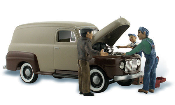 Three shade-tree mechanics discuss the automotive squeaks and whistles of an old panel truck.