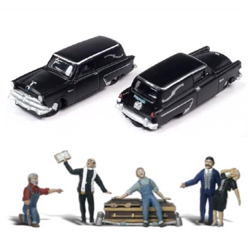 Includes 6 hand-painted figures & Ford Hearse funeral cars (2-Pack)
