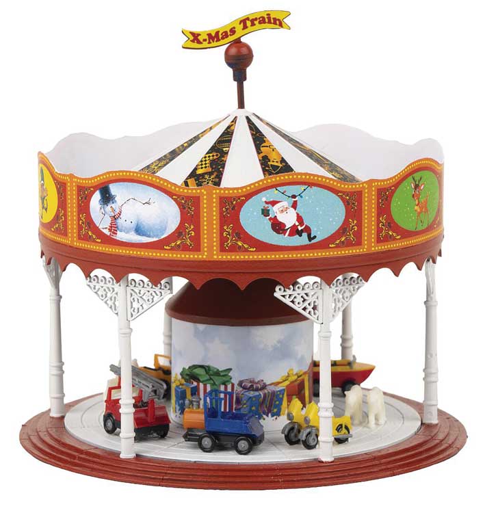 Cozy atmosphere at the Christmas market! Decoration set with two classic Christmas market stalls offering finger noodles, raclette and hot punch. Another experience on the HO model railroad layout is offered by the X-mas train carousel (not a functional model), which lights up more than just children's eyes. The carousel can be driven with the Synchronous hobby motor, Art. 180629 (sold separately).
